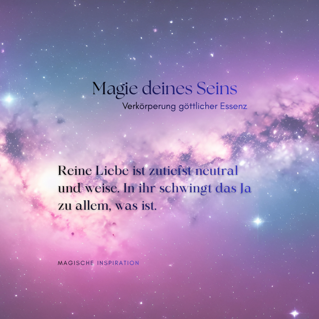 Reine Liebe ist zutiefst neutral und weise. In ihr schwingt das Ja zu allem, was ist. Reine Liebe zweifelt nicht. Sie ist unbequem und wild und sie fordert auf zu fühlen – sie rüttelt und treibt an, all das zu fühlen, was bisher nicht gefühlt werden konnte. Sie schiebt dich in die Erinnerung, dass du zu Ende geliebt worden bist.