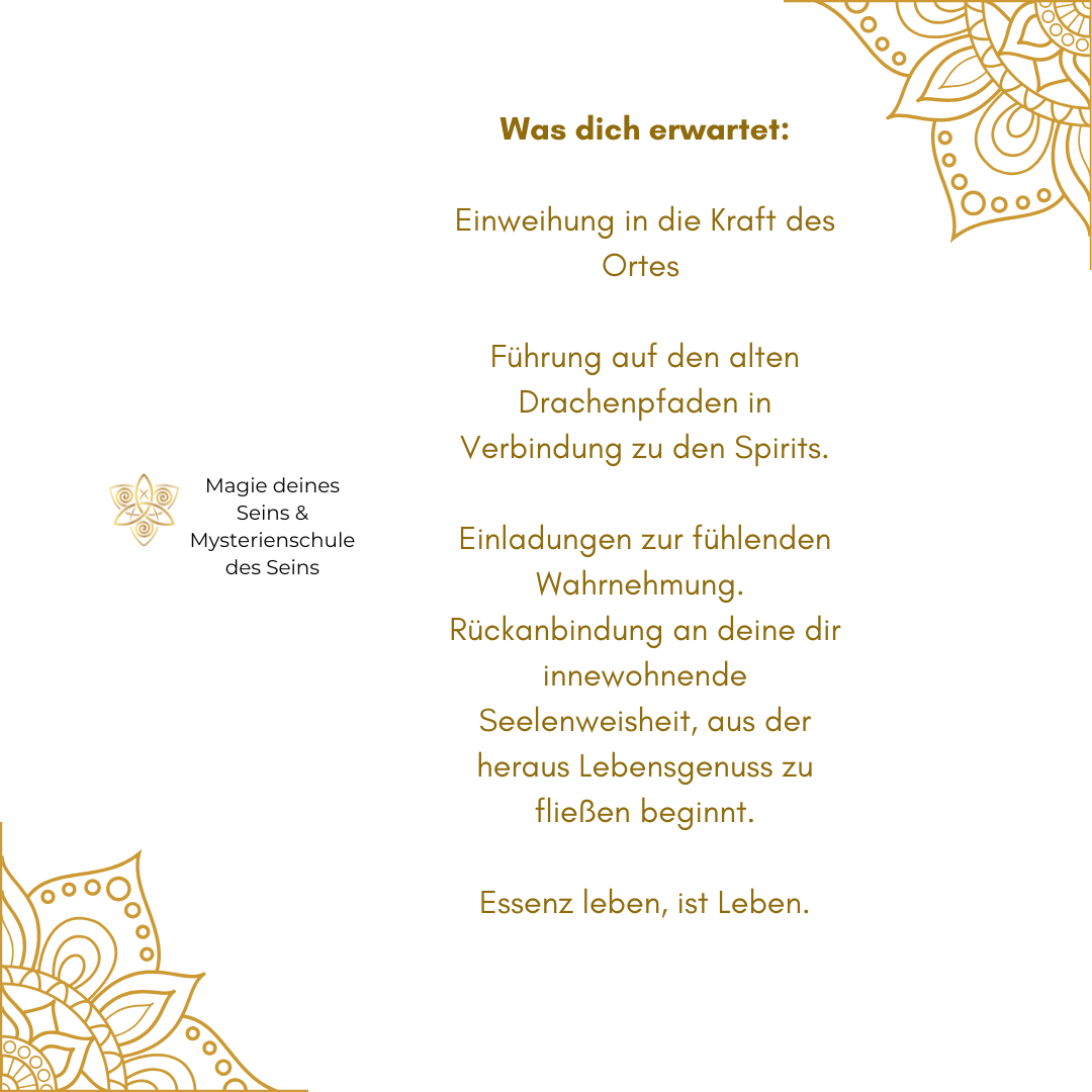 In drei Tagen begleite ich dich auf den alten Einweihungswegen, die anders sind, als die Wanderrouten vor Ort. Finde über die Energie des Ortes wieder den tiefen Zugang zu dir selbst und sei in der Herzensverbindung mit anderen und in einer Gruppe von maximal 5 Personen, in der Jede und Jeder seinen individuellen Raum hat.